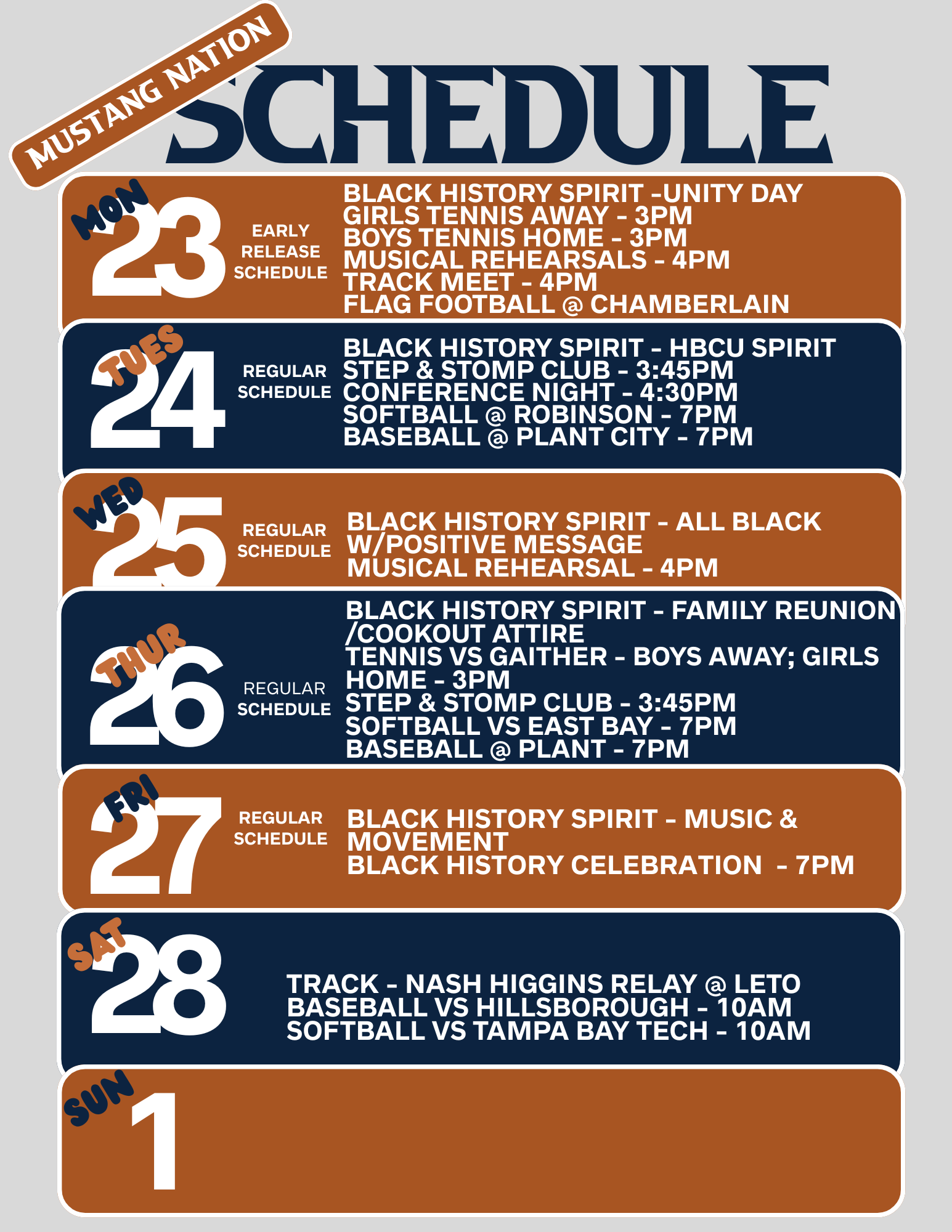In addition, this week we are celebrating Black History Month with Spirit Week. We encourage all students to participate and show their school pride. Please refer to the school calendar for daily spirit week themes.
