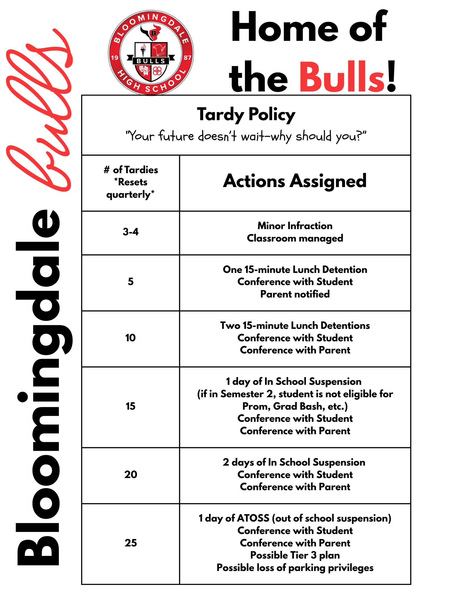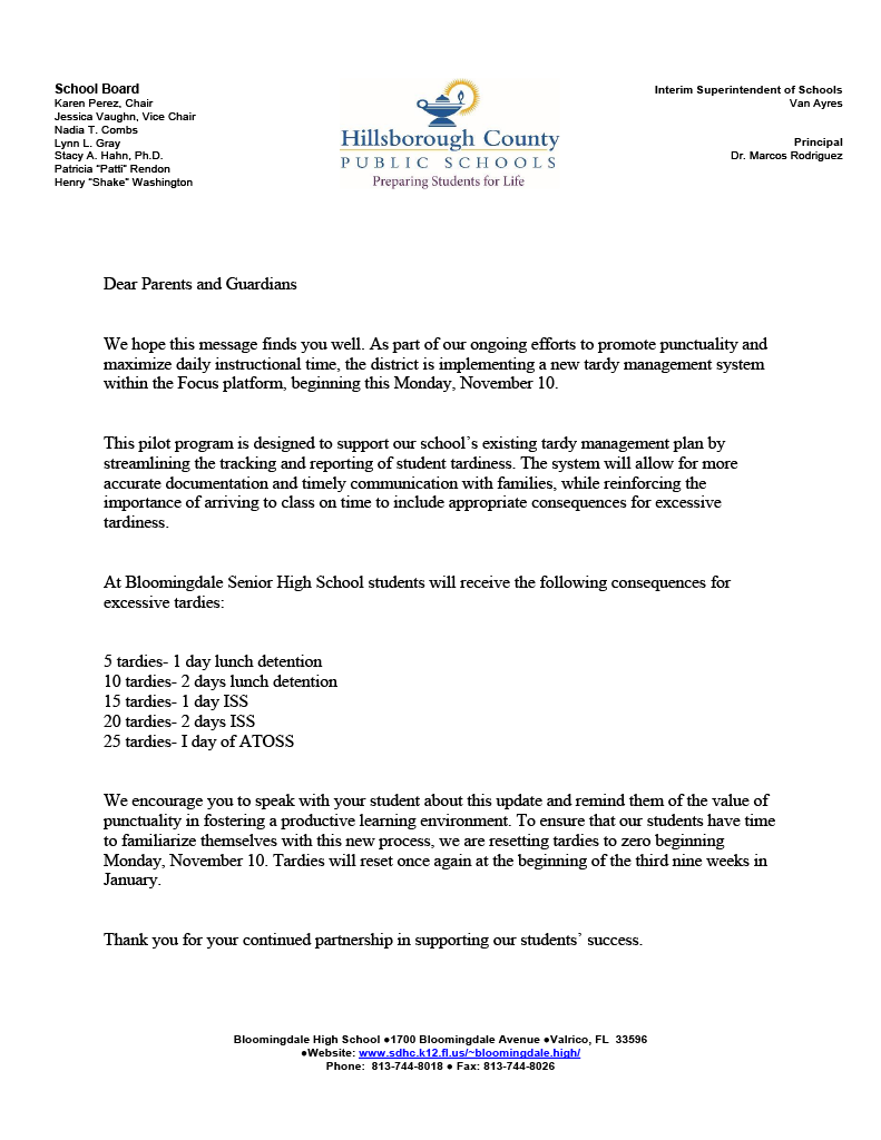 At Bloomingdale Senior High School, we believe that consistent attendance is key to student success. Every day in class is an opportunity to learn, grow, and stay on track. When students are present, they’re more likely to achieve academic goals, build strong relationships, and prepare for future opportunities. Let’s work together to ensure our students show up, every day, ready to succeed!
