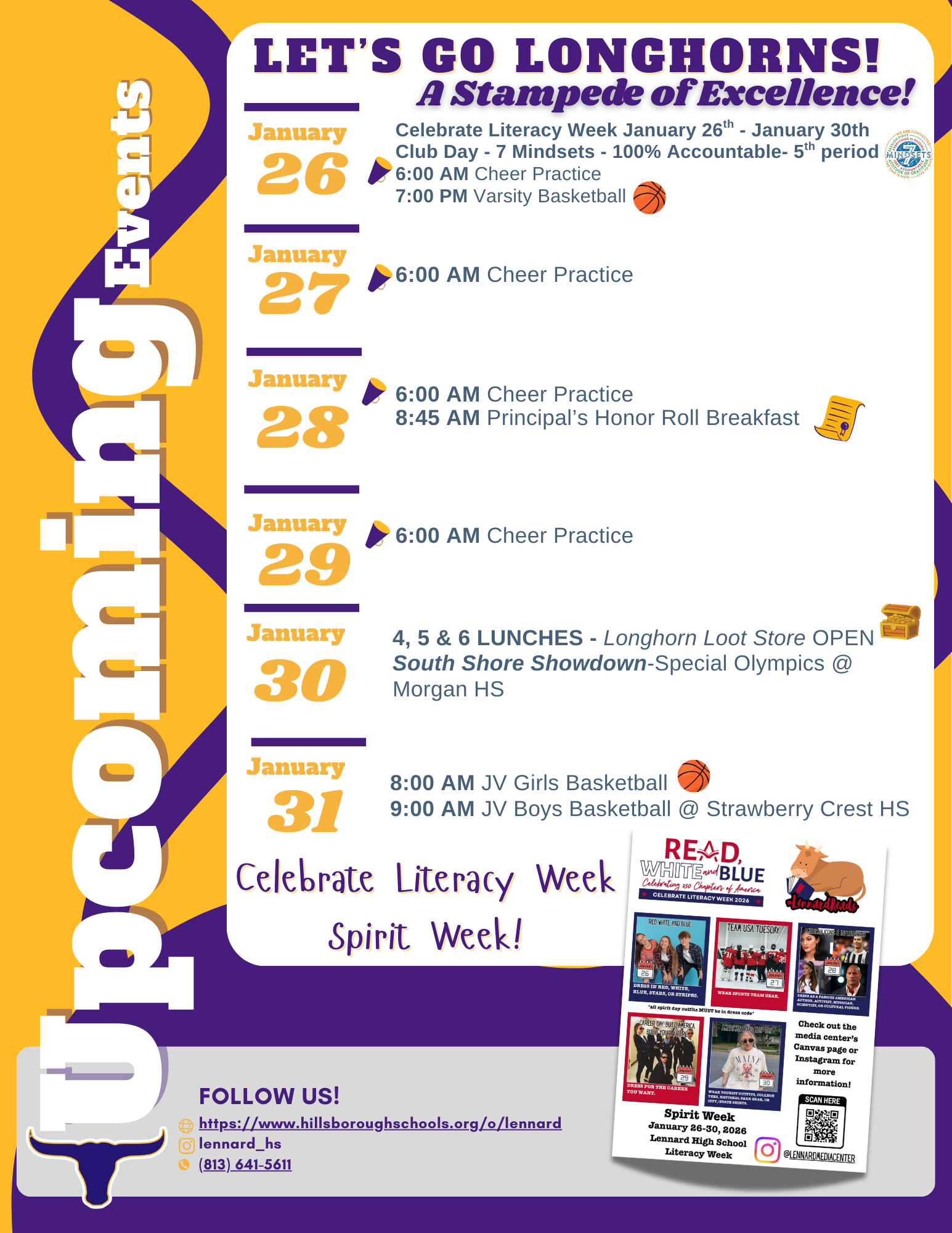Celebrate Literacy Week, Florida will be held January 26th through January 30th. This is a program that is designed to raise awareness about the importance of reading and to inspire Florida's students and families to make reading part of their daily routines. We have many fun and exciting activities planned for this week here at Lennard High school. Please see the full schedule below for all of the details and make sure you join in on the fun.