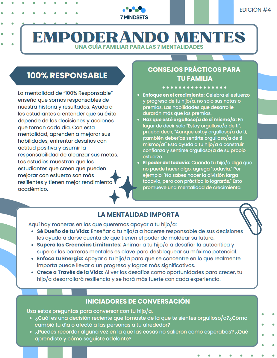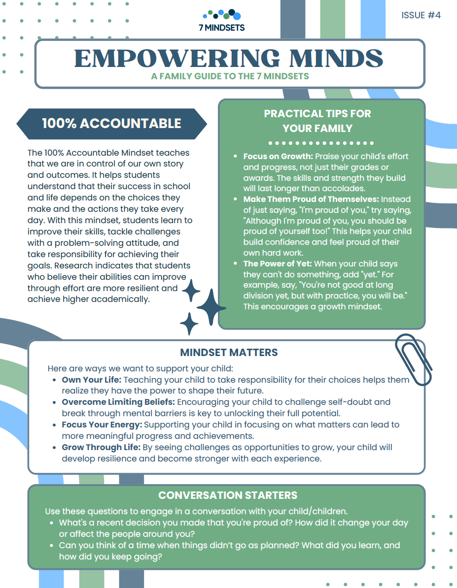For the month of January, our 7 Mindsets focus is 100% Accountable. This Mindset teaches us that we are not victims of our past, our future is not predetermined, and our lives are what we choose from this moment forward. We will focus on breaking down barriers, freeing our minds, and focusing our energy on taking critical steps toward our goals. Students will explore more about this mindset on the January Club Day.