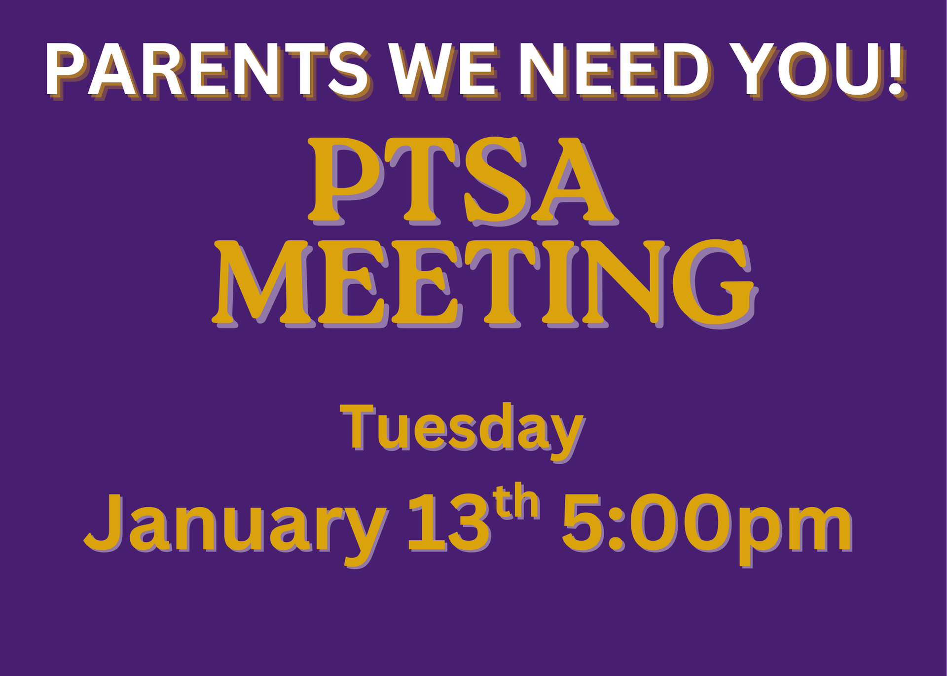 Tuesday 1/13- PTSA General Meeting at 5:00 pm- https://us06web.zoom.us/j/83502181366?pwd=sjXHTaJv1ZqWl7IbP5dTFuboKeoPVi.1