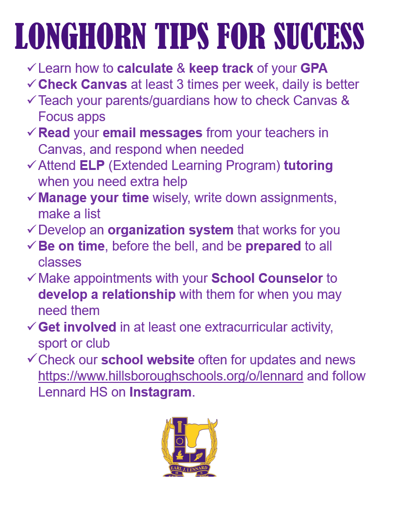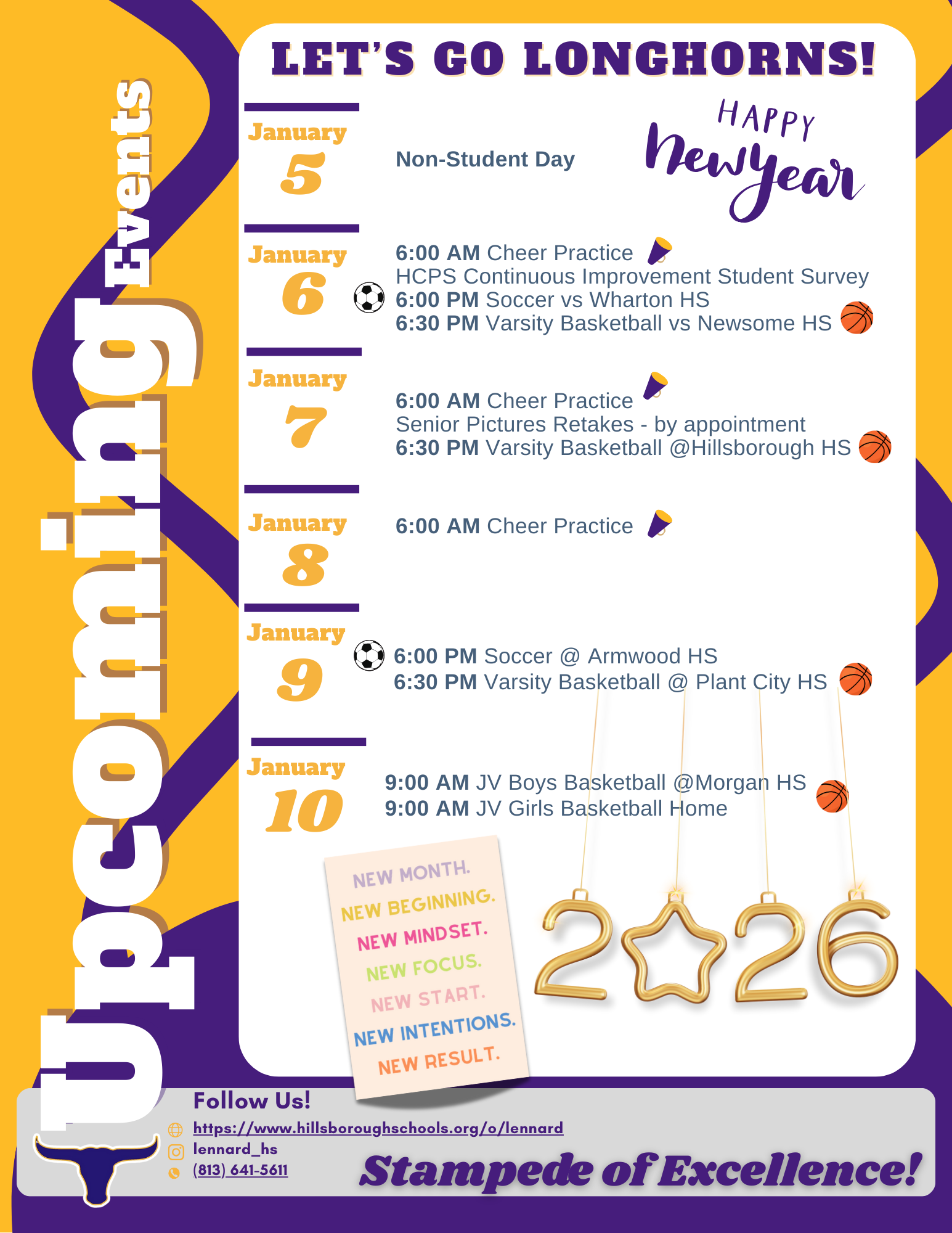 Our students, families and staff will be participating in our Hillsborough County Public Schools Continuous Improvement Panorama Survey this month. Our Longhorns will be participating in the survey on Tuesday, January 6th, during their extended first period class. All families should receive a direct email from HCPS district with your link to participate in the survey. The purpose of the survey is to receive feedback on how we are doing at Lennard High School, and as a school district as a whole, with our goals outlined within our High Reliability Schools program. Thank you in advance for your time and participation, and we look forward to your feedback.