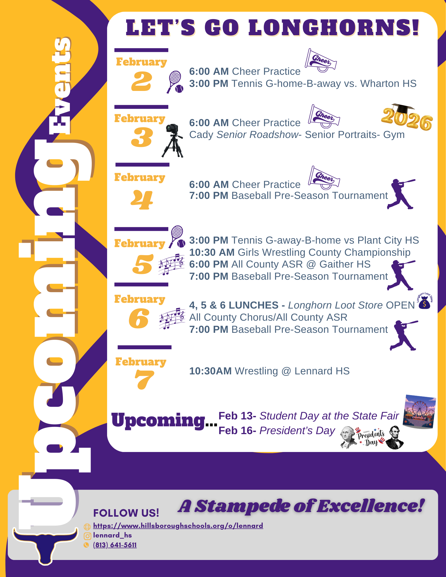 Friday 2/13- Family Day at the Florida State Fair- Non-Student Day Monday 2/16- President's Day- Non-Student Day Thursday 2/19- Senior Panoramic Picture - Gym - 8:30 AM Friday 2/20- Longhorn Loot Store Open - lunches