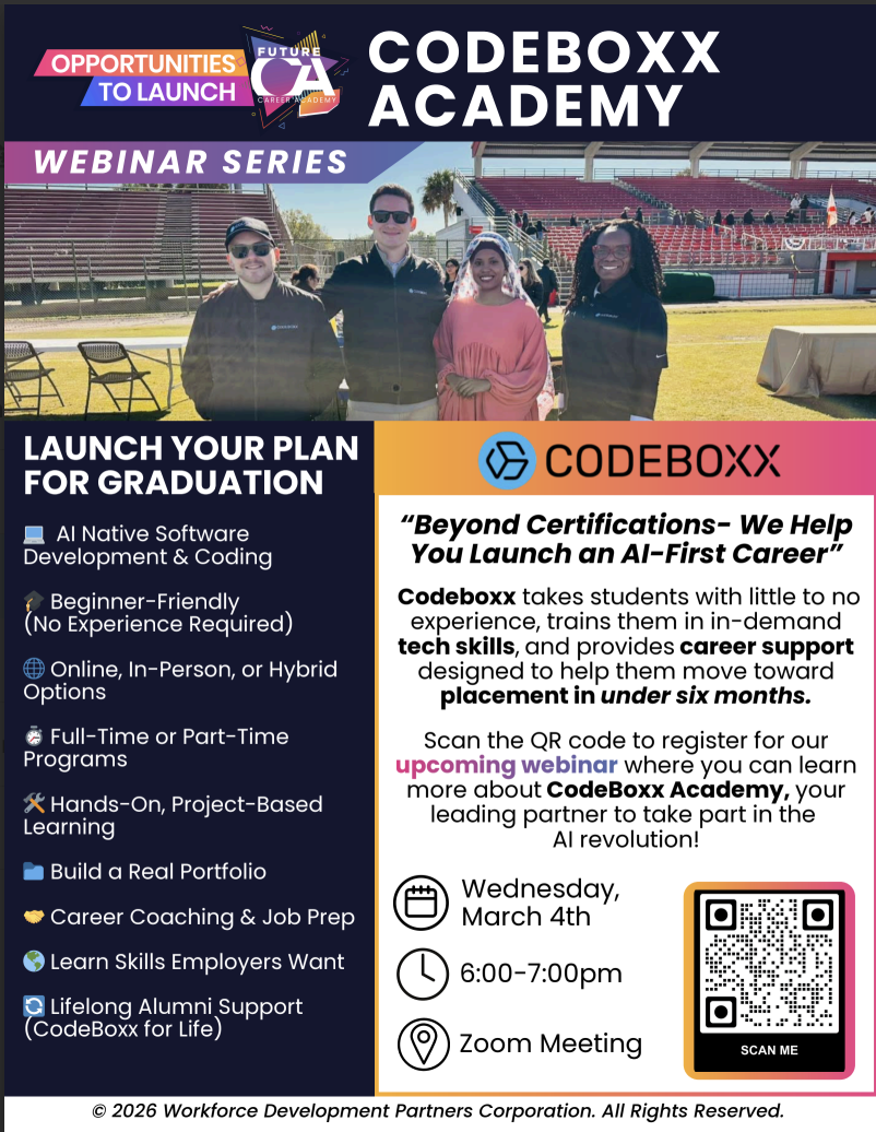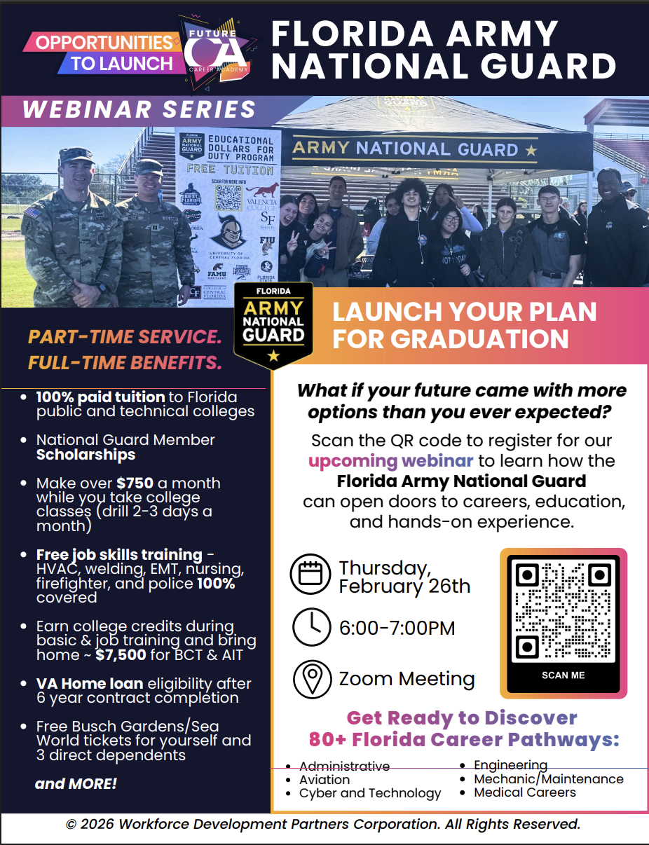 Future Career Academy is excited to launch our 25-26 SY webinar series of informational sessions designed to directly connect students with leaders in high-demand industries! 🚀 Florida National Guard Webinar | 2.26.26 @ 6:00 pm