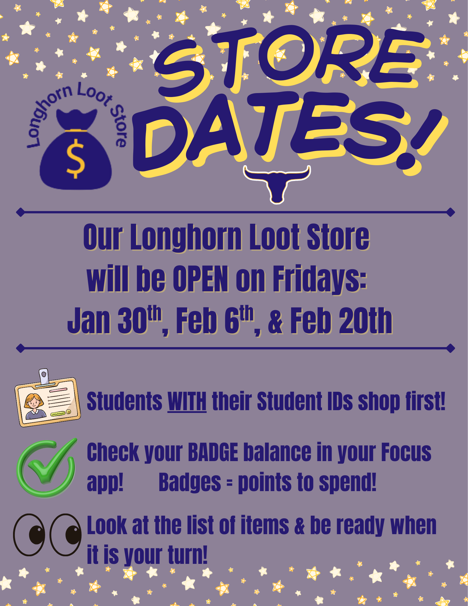 Our Longhorn Loot Store (PBIS Rewards Store) is OPEN for students on select Fridays! We need your help to stock it with exciting items to make this a huge success! Click here to donate via our Amazon Wishlist: