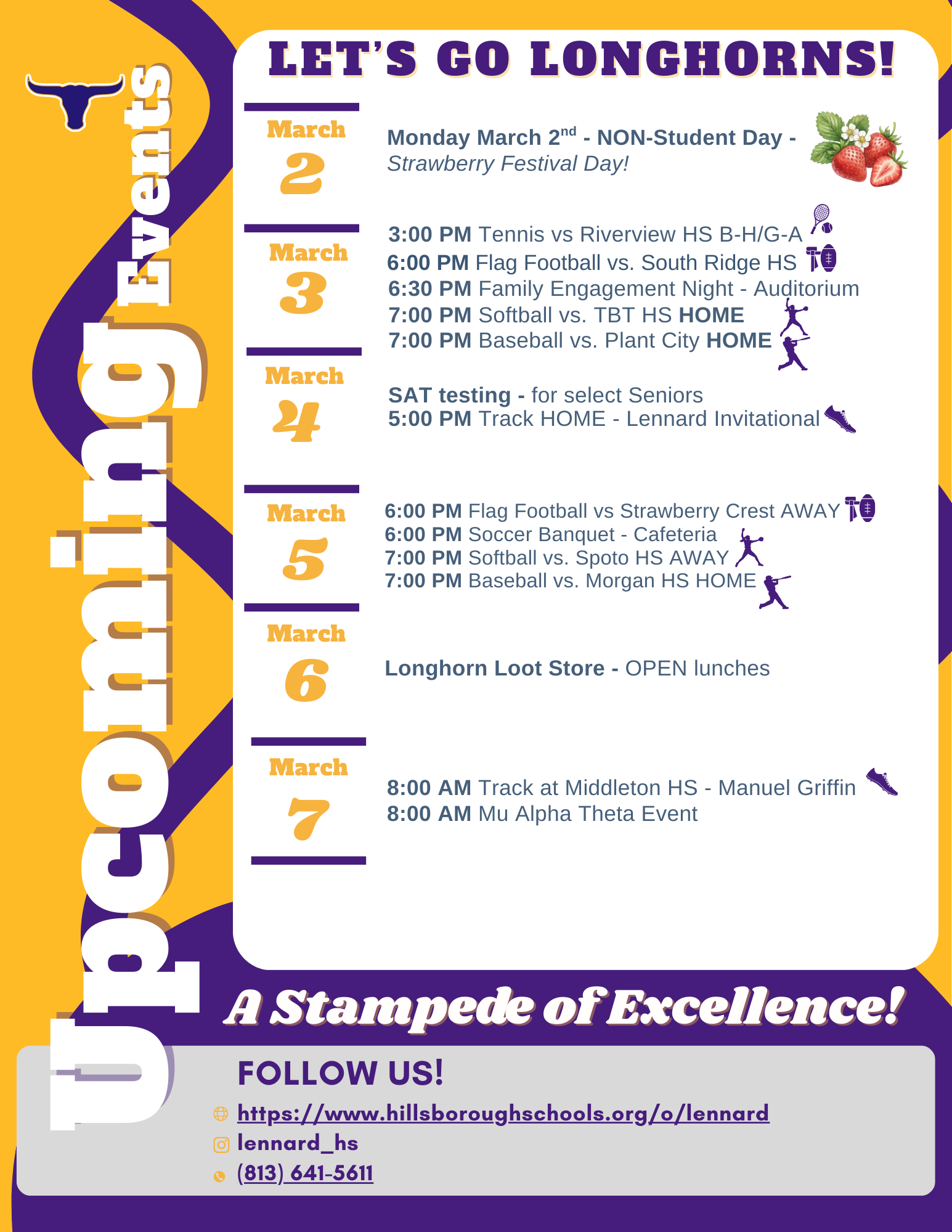 This coming week is National School Breakfast Week, and all Longhorns are reminded that breakfast is available, for free, for every student, every day. You can check out the school breakfast and lunch menus here - Breakfast and Lunch Menus. There is a special HCPS district Parent Engagement night, Guiding Parents to Success, planned for Tuesday, March 2nd at 6:30 pm in our auditorium. All of our Longhorn parents, guardians and students are invited to join us and learn more about opportunities, guidelines and requirements for the high school years and beyond.