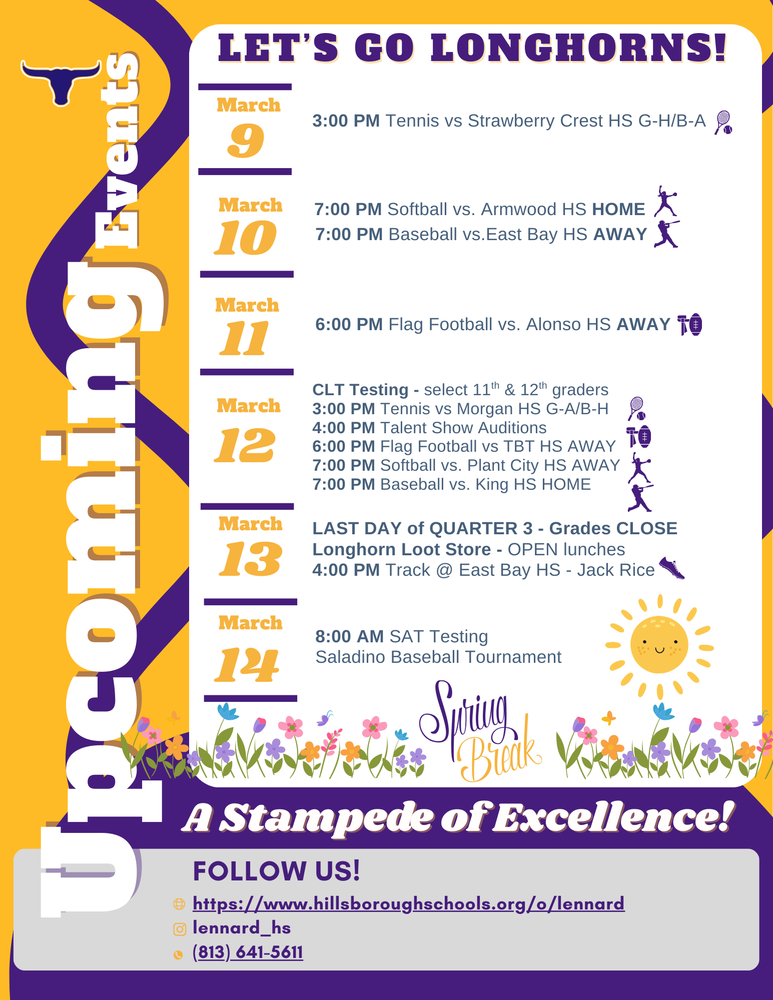 We hope everyone has a wonderful Spring Break. We will welcome students back on Tuesday, March 24th, to finish out the school year recharged and ready for quarter four, state testing and semester exams in May! Let's continue our Stampede of Excellence, Longhorns! Your Administration Team |