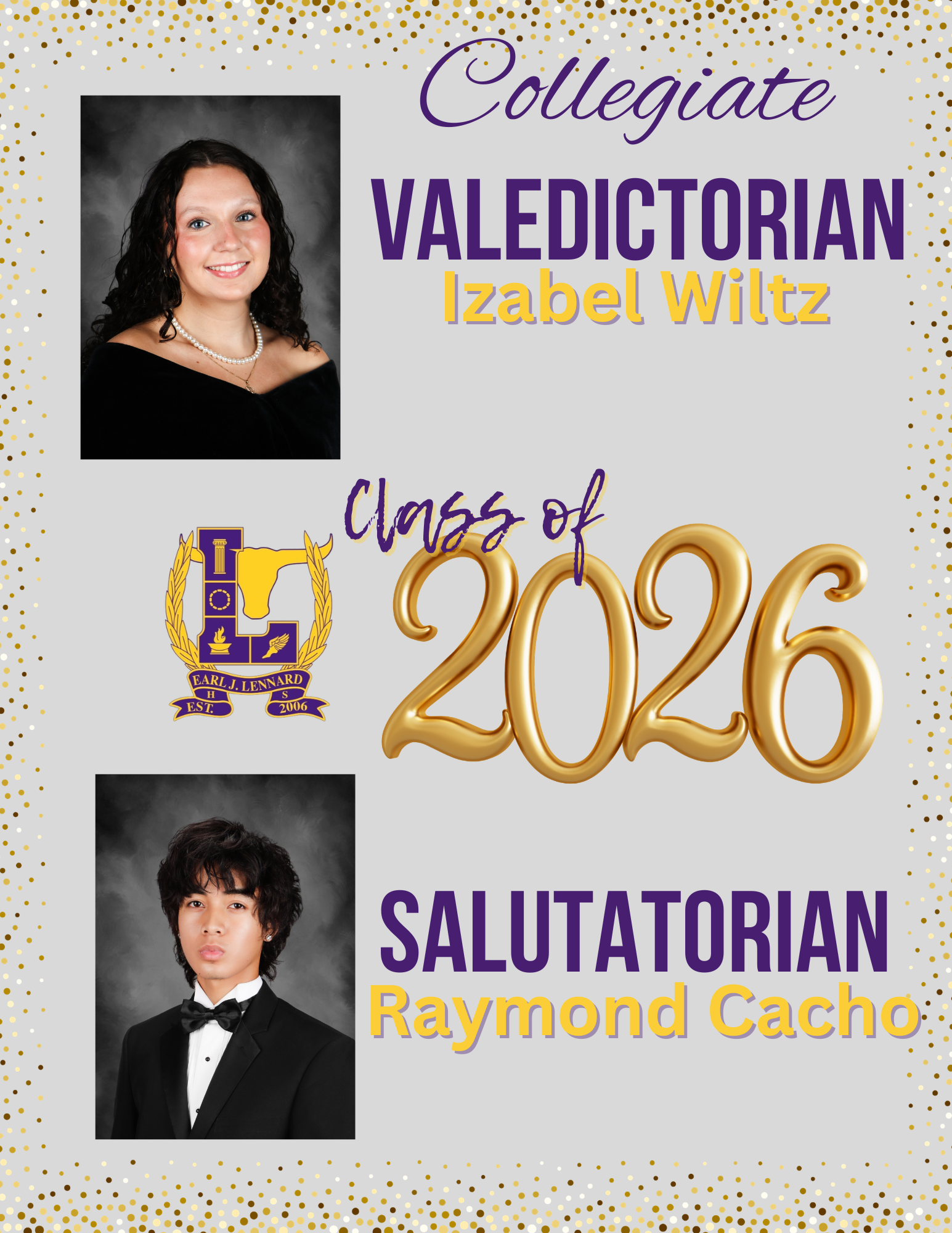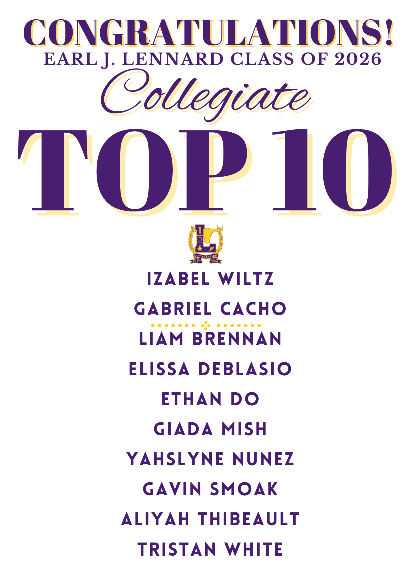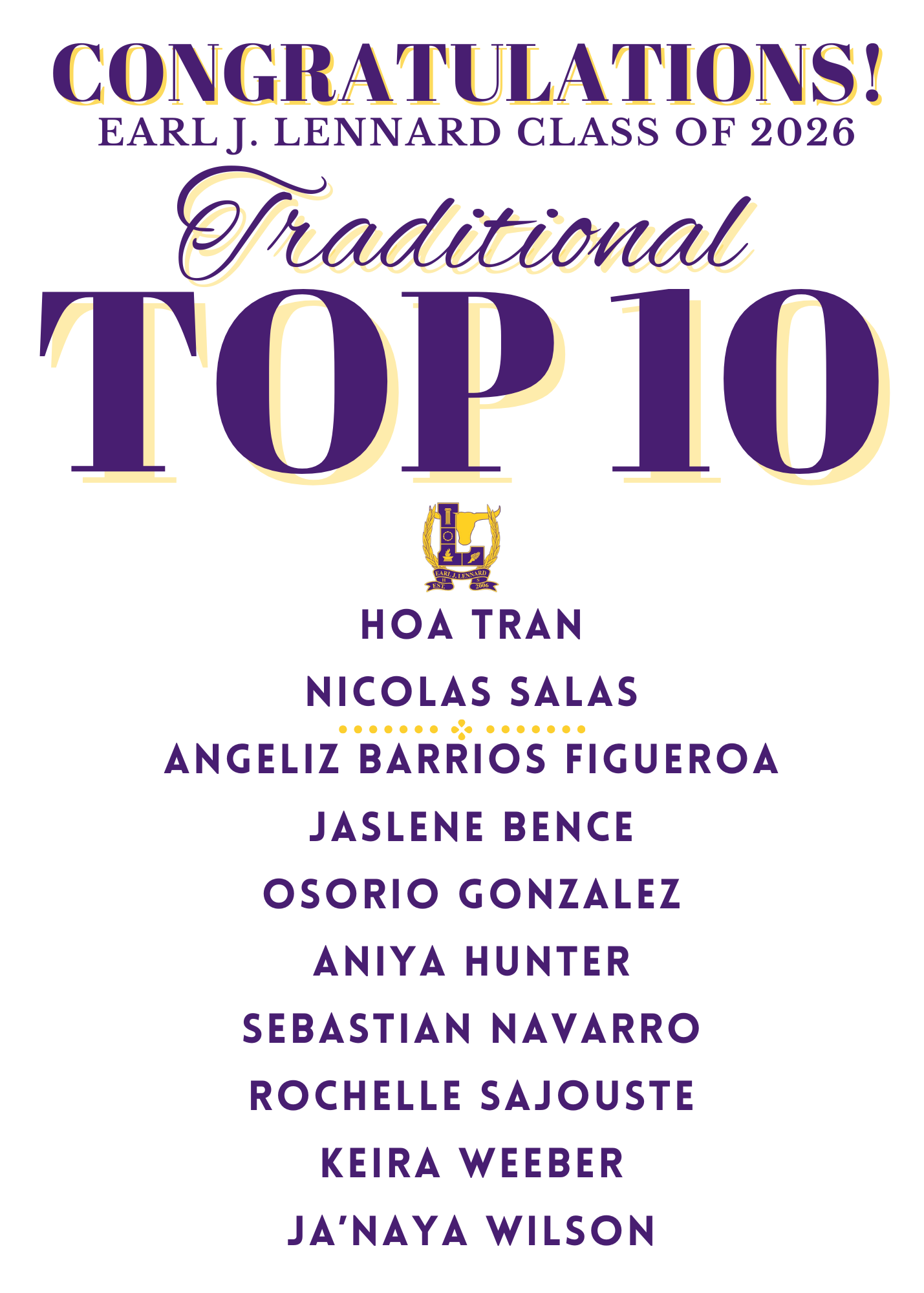 Congratulations to both groups of Top 10 students in our Collegiate Academy and Traditional enrollment programs at Lennard High School. We are so proud of you and your academic accomplishments! We know that you will continue to be successful well into your future endeavors. This week, is the last week of quarter three. Students and parents, please check Canvas to review progress in courses. We want to finish this quarter strong.