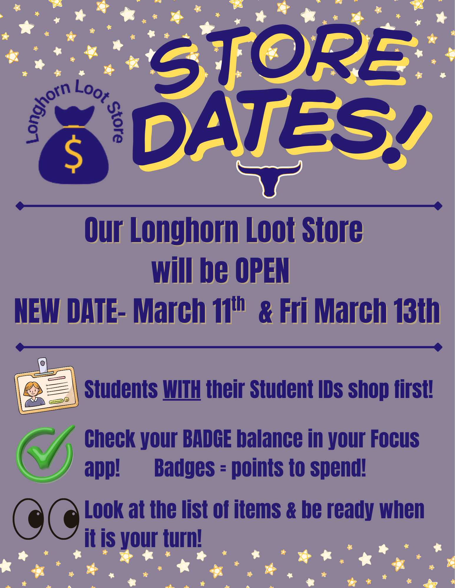 Our Longhorn Loot Store (PBIS Rewards Store) is OPEN for students on select Fridays! Students use their reward points (badges) to purchase items in the store. We need your help to stock it with exciting items to make this a huge success! Click here to donate via our Amazon Wishlist: PBIS Store Wishlist