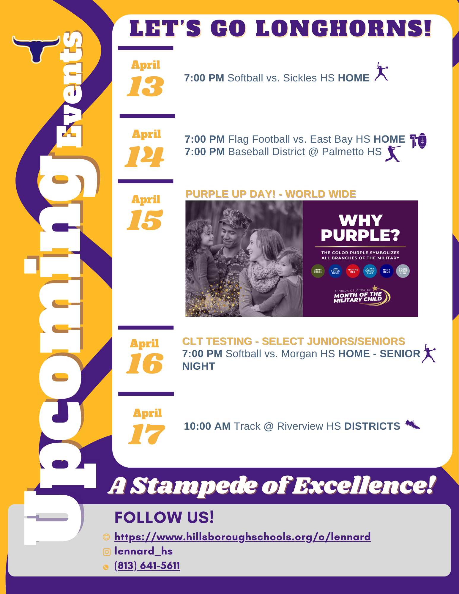As a school with military students, we proudly recognize Month of the Military Child this April. We are honored to support our military-connected students and families, whose strength and perseverance enrich our school community. Purple Up Day 2026 Worldwide is April 15th. Please show your support and wear purple on Wednesday.