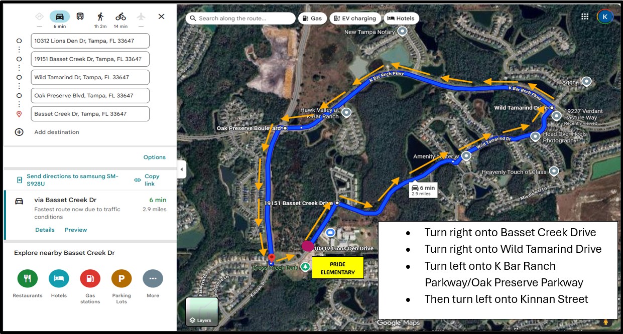 As a result, all vehicles exiting Pride Elementary will be required to turn right out of the parking lot. To navigate around the closure and get back to Kinnan Street, please follow the route shown below.