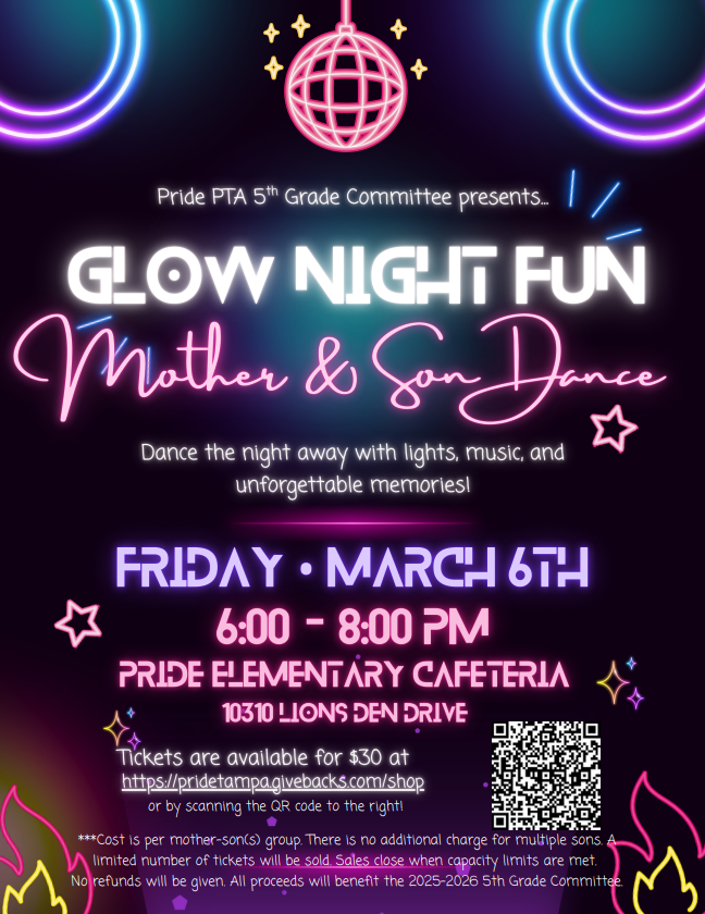 February was absolutely jam‑packed and flew right by! On Friday, we had the joy of hosting our Kindergarten Orientation, where we welcomed our future kindergarten families, shared important information, and gave our newest Lion Cubs a glimpse of what makes Pride Elementary such a special place to learn and grow. If you know a family with a child entering kindergarten next year, please encourage them to visit our website or call the school for information about kindergarten registration. Alright boys — it’s your turn! Our girls had an amazing time at the Daddy Daughter Dance earlier this month, and we promised the fun wasn’t over. This Friday, March 6th, it’s time for the Mother & Son GLOW PARTY! Do you have your tickets yet? Be sure to grab them before they sell out- all the details are below in this newsletter.