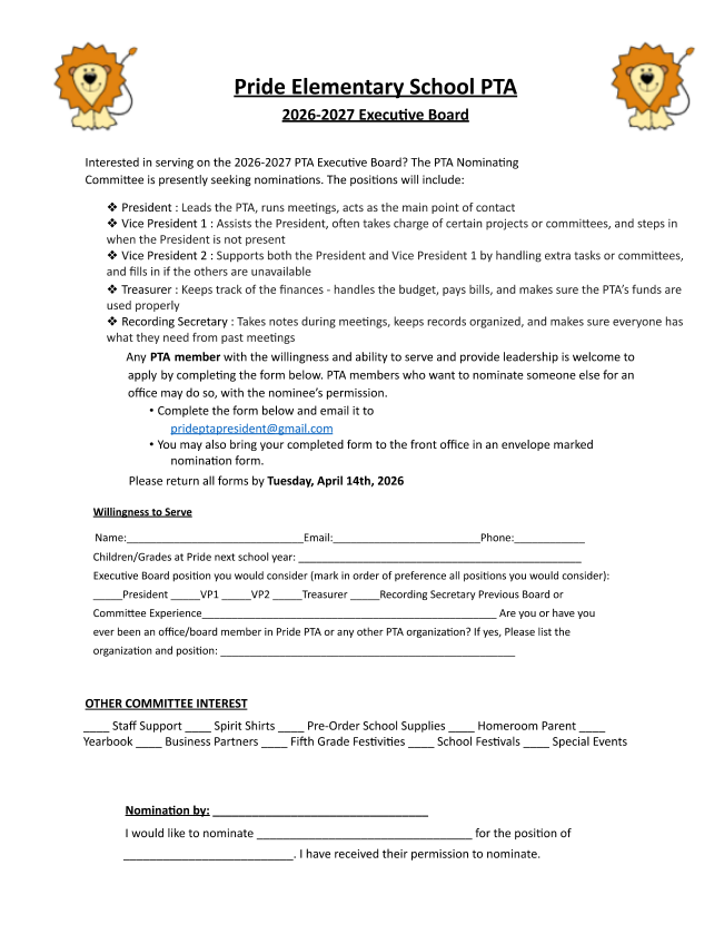If you’re interested (or would like to nominate someone with their permission), please complete the PTA Nominating Form and return it by Tuesday, April 14, 2026. Forms may be emailed or dropped off at the front office. Let’s work together to continue making Pride an amazing place for our students and families! 💙🦁